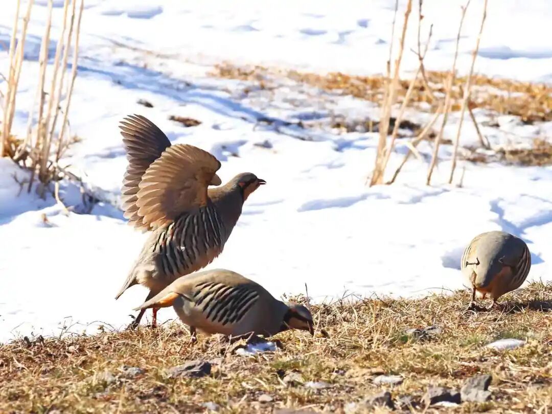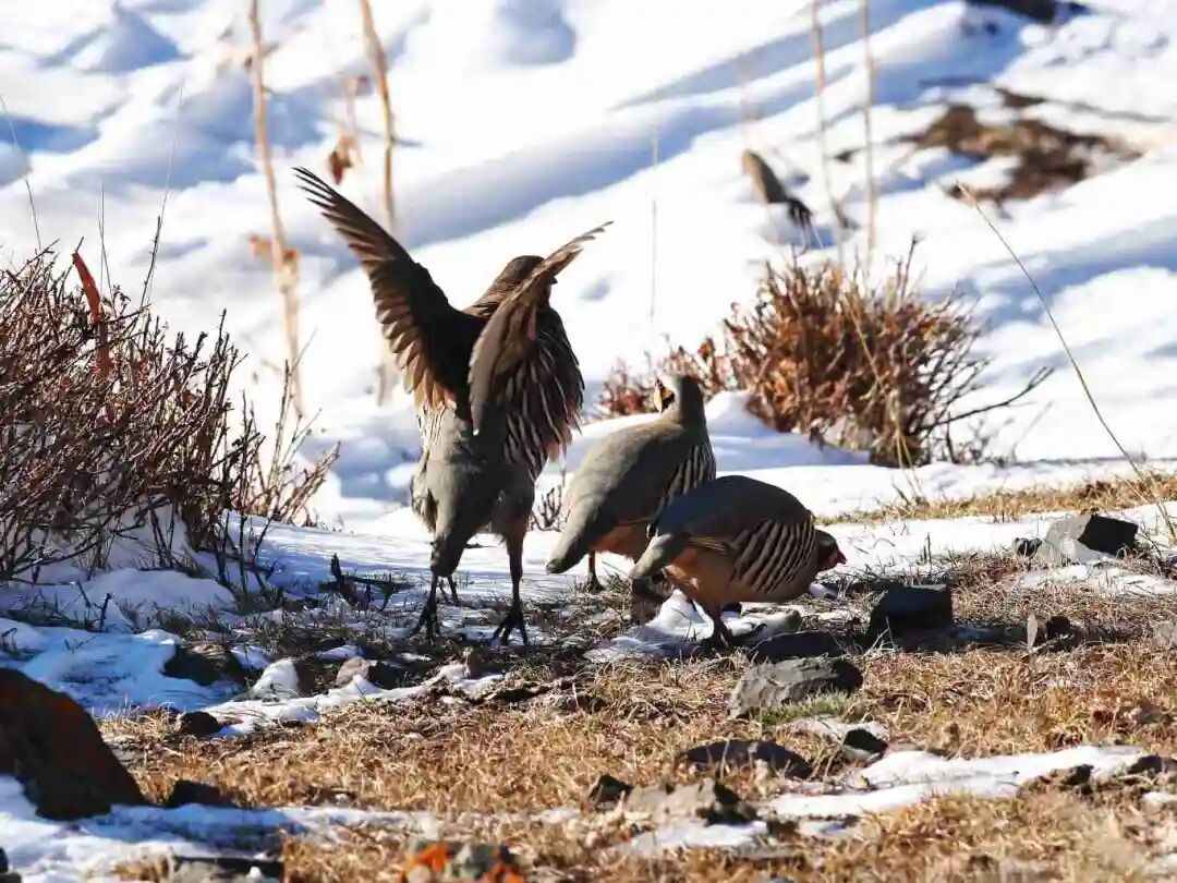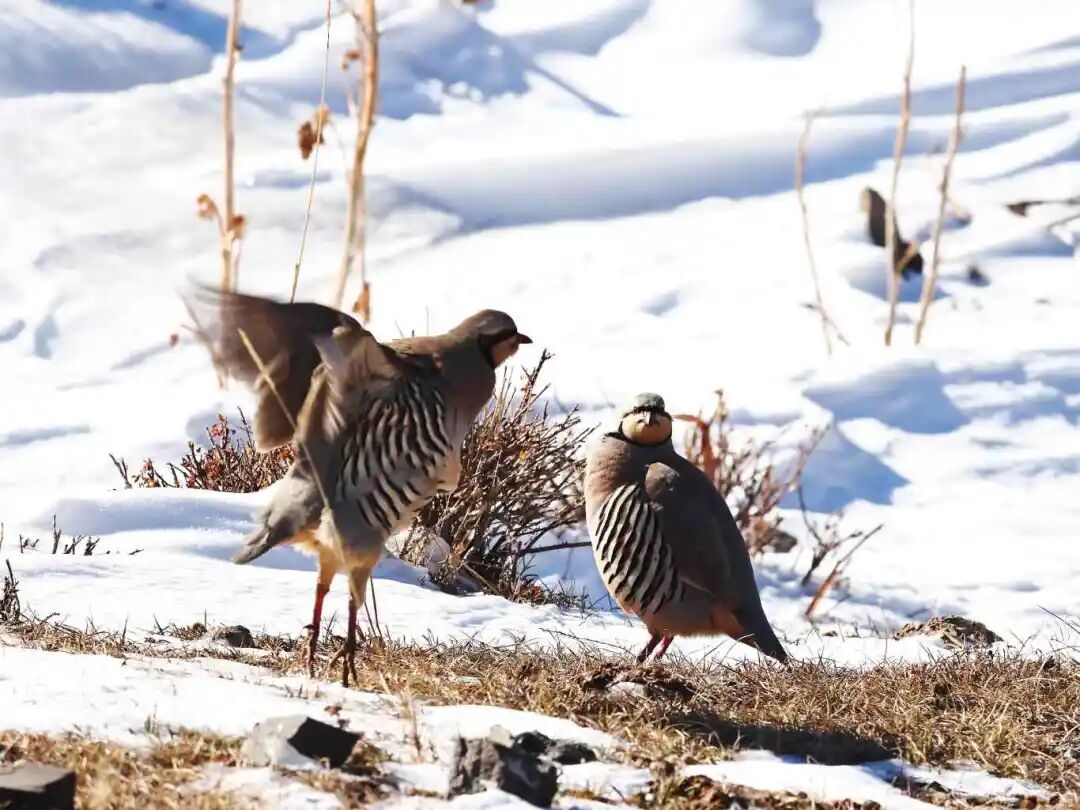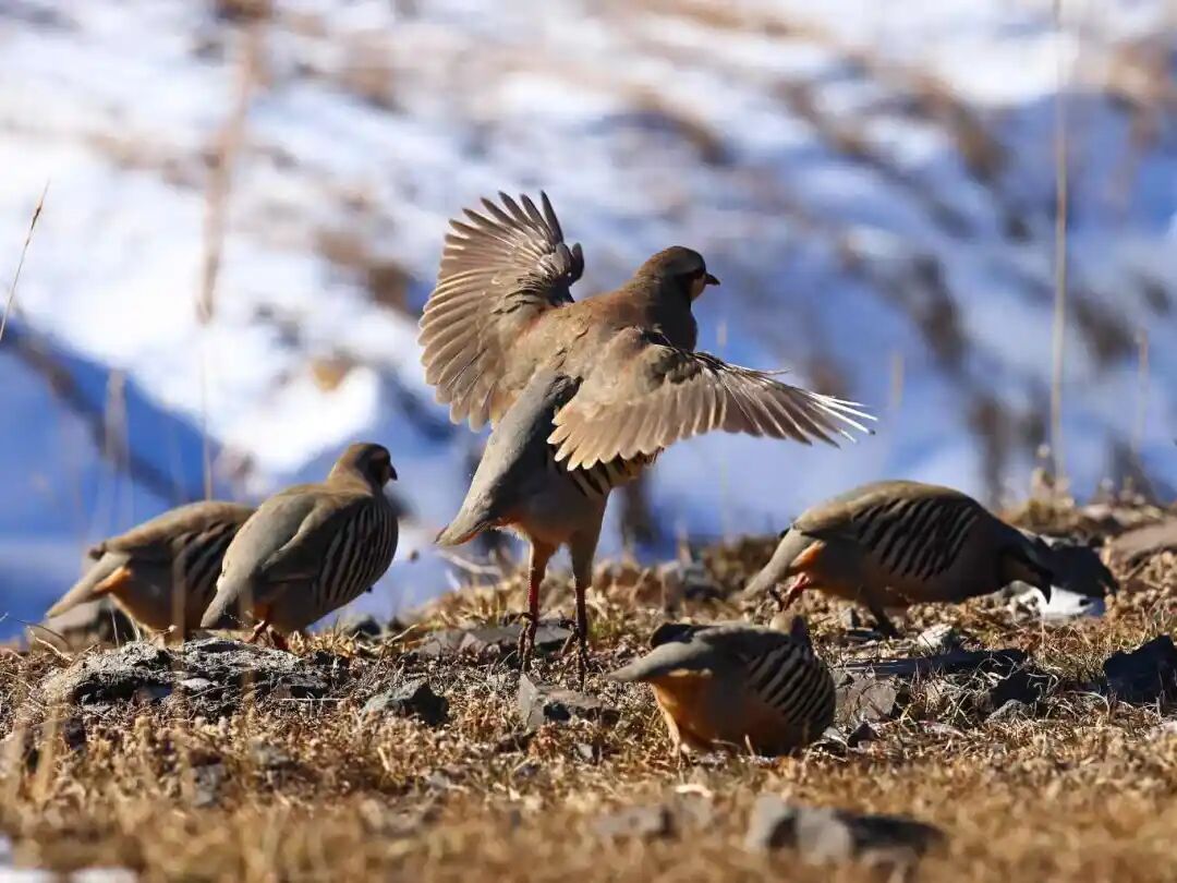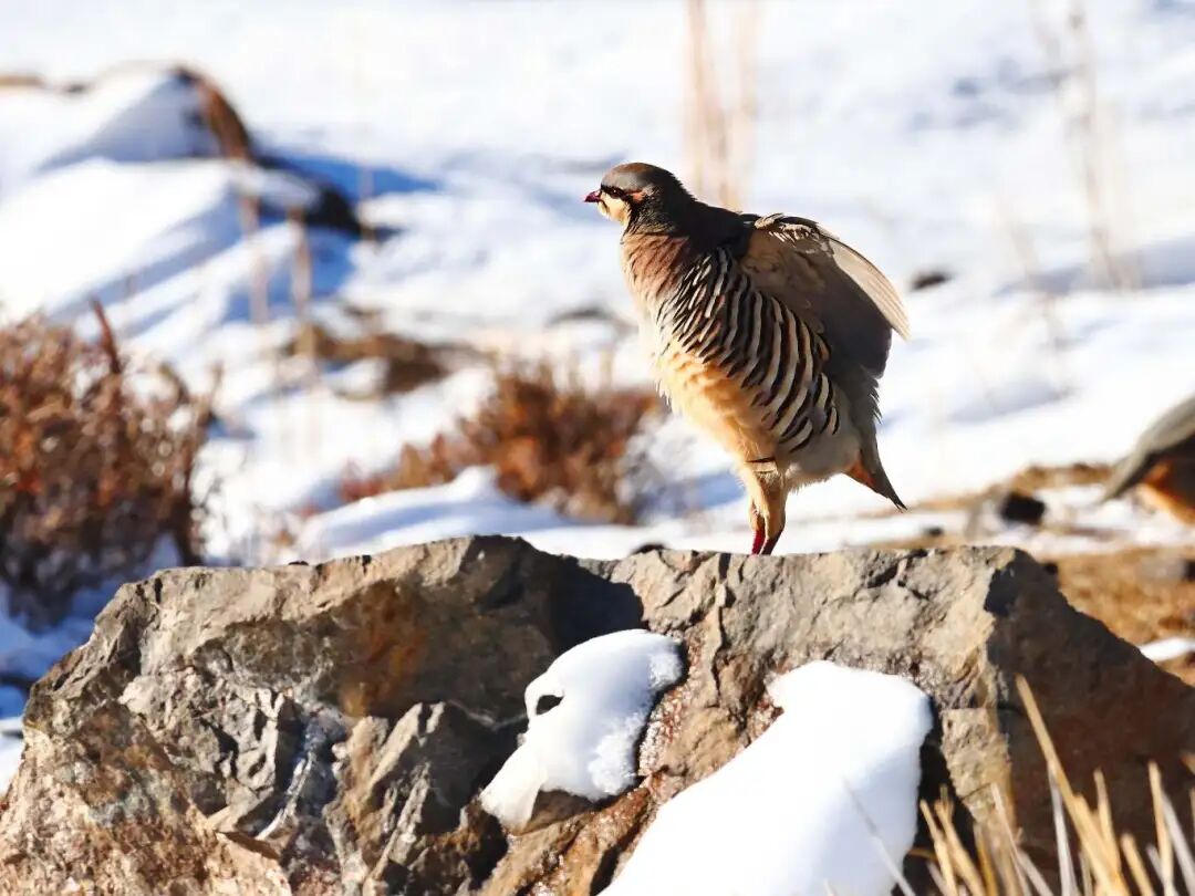 12月26日,在托里县巴尔鲁克山区,笔者用镜头定格下石鸡的灵动身影。在雪域之上,石鸡或立于岩石眺望,或群聚草间嬉戏,棕灰的羽色与白雪相映,翅尖扬起的风成了冬日里最温柔的笔触。(常佃学)