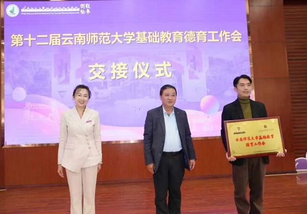 随后,云南师范大学附属世纪金源学校副校长李文江与云南民族中学副校长鲍学良完成了第十二届德育工作会的承办交接仪式。