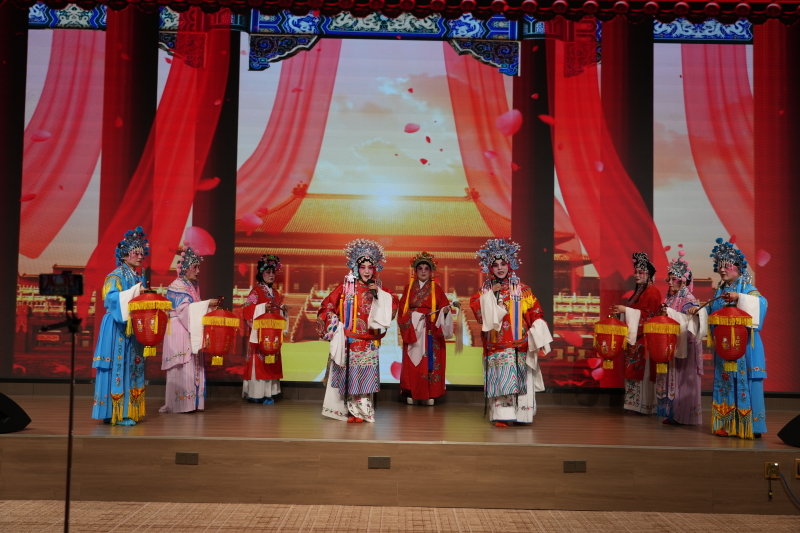 文艺演出环节分为“初心如磐、同心聚力、雄心致远”三个篇章,节目精彩纷呈:塔城市新联会选送的乐器演奏《大登殿》以秦腔展现浓郁地域文化;额敏县新联会的舞蹈《情暖额敏河》讲述守护天鹅的公益故事;乌苏市新联会王静带来的歌曲《世界赠与我的》传递奋斗初心,还有情景剧、说唱、民族舞蹈等节目轮番上演,最后全体合唱《没有共产党就没有新中国》将现场气氛推向高潮。互动游戏“初心拼图”以手风琴塔城印记和石榴团结象征为主题,让参与者在协作中感受家乡情怀与团结力量。