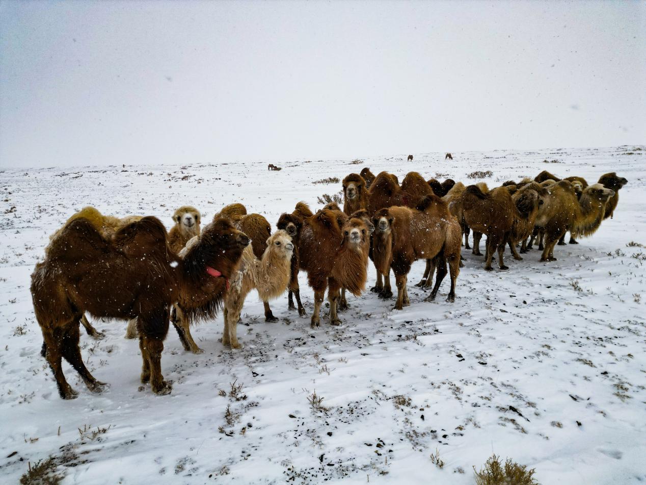 2025年12月29日,木垒县博斯坦乡霍勒斯特沟冬牧场,大雪纷飞,数十峰骆驼慢悠悠地嚼着从雪窝里扒拉出来的草,周围却不见牧民。