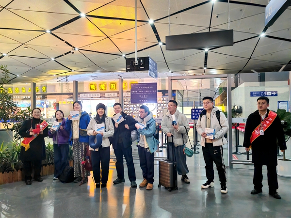 活动现场,机场工作人员身着喜庆节日服饰,为过往旅客送上暖心祝福与精美礼品;悠扬的歌声、灵动的舞姿交织成欢乐的乐章,乐团演奏、歌舞快闪等特色节目轮番上演,引得旅客纷纷驻足观赏、拍照留念。