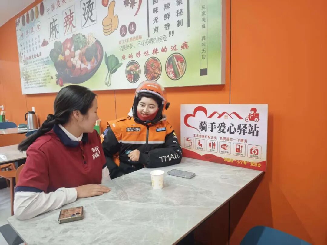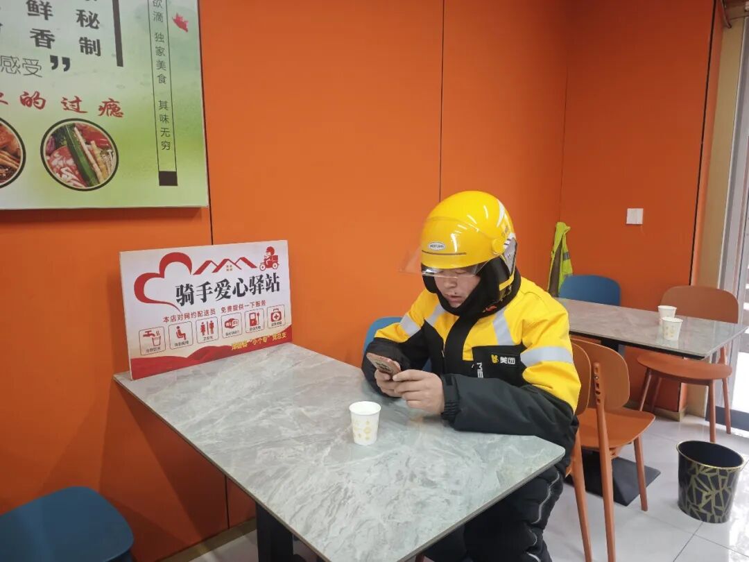 1月6日,在泽普县内一家餐饮店,刚走进店门,醒目的“骑手爱心驿站”标识牌便映入眼帘。店内三五名外卖骑手正趁着订单间隙在此休息,有的端着刚接的热水暖手,有的围坐在一起轻声交谈,卸下了奔波的疲惫,脸上满是放松的神情。