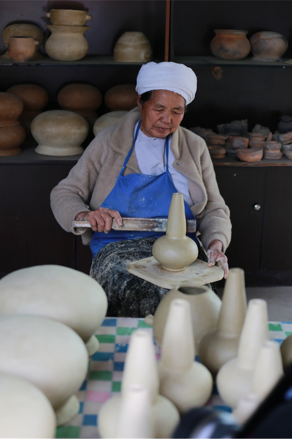 勐永镇城子村土陶制作省级非遗传承人宋永荟是该村6户从事土陶制作的傣族农户之一,她从事土陶制作三十多年,凭借多年对土陶制作这门手艺的热爱,土陶制作就在家里进行,既可以照顾老人和外孙女,也可以同时分出一部分时间制作土陶,一年收入一万多元补贴家用。