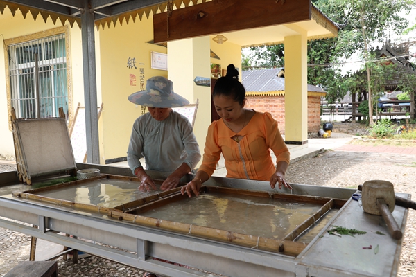 芒团傣族手工造纸是以当地构树皮为原料,经过浸泡、蒸煮、捶打、抄纸等十余道复杂工序制成,纸张质地柔韧、纹理天然,是国家级非物质文化遗产。