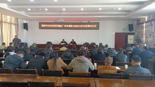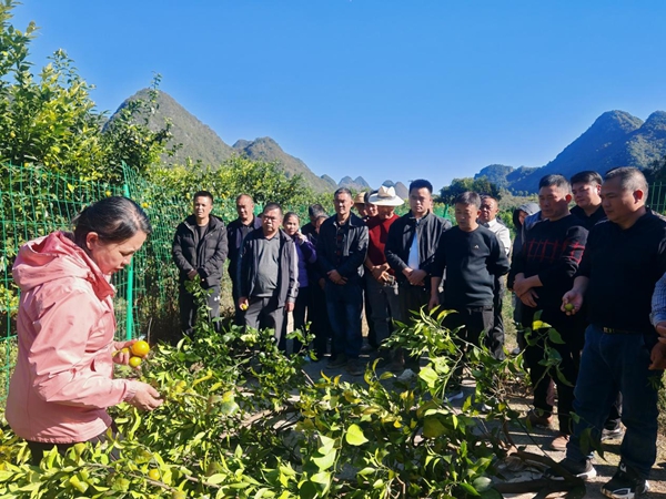 在广南县莲城镇细掌村的柑橘种植基地里,柑橘黄龙病防控技术培训正在进行。来自全县18个乡镇的柑橘种植户认真听取农技人员就柑橘黄龙病识别与监测方法、科学防控技术及药剂使用规范等进行系统培训,为柑橘种植户送去“科技套餐”。