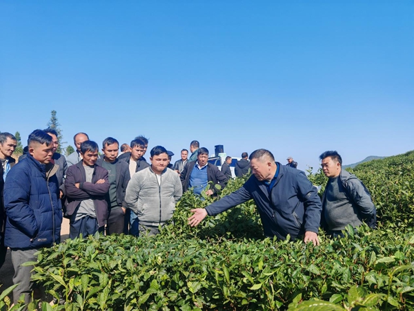 在广南县底圩乡同剪村的连片茶叶种植基地里,农技人员正在指导茶农对茶树进行修剪,及时纠正过度修剪导致来年茶叶产量减产问题。在现场,农技人员手持修剪设备,为茶农作示范修剪,手把手教茶农留足生产枝。
