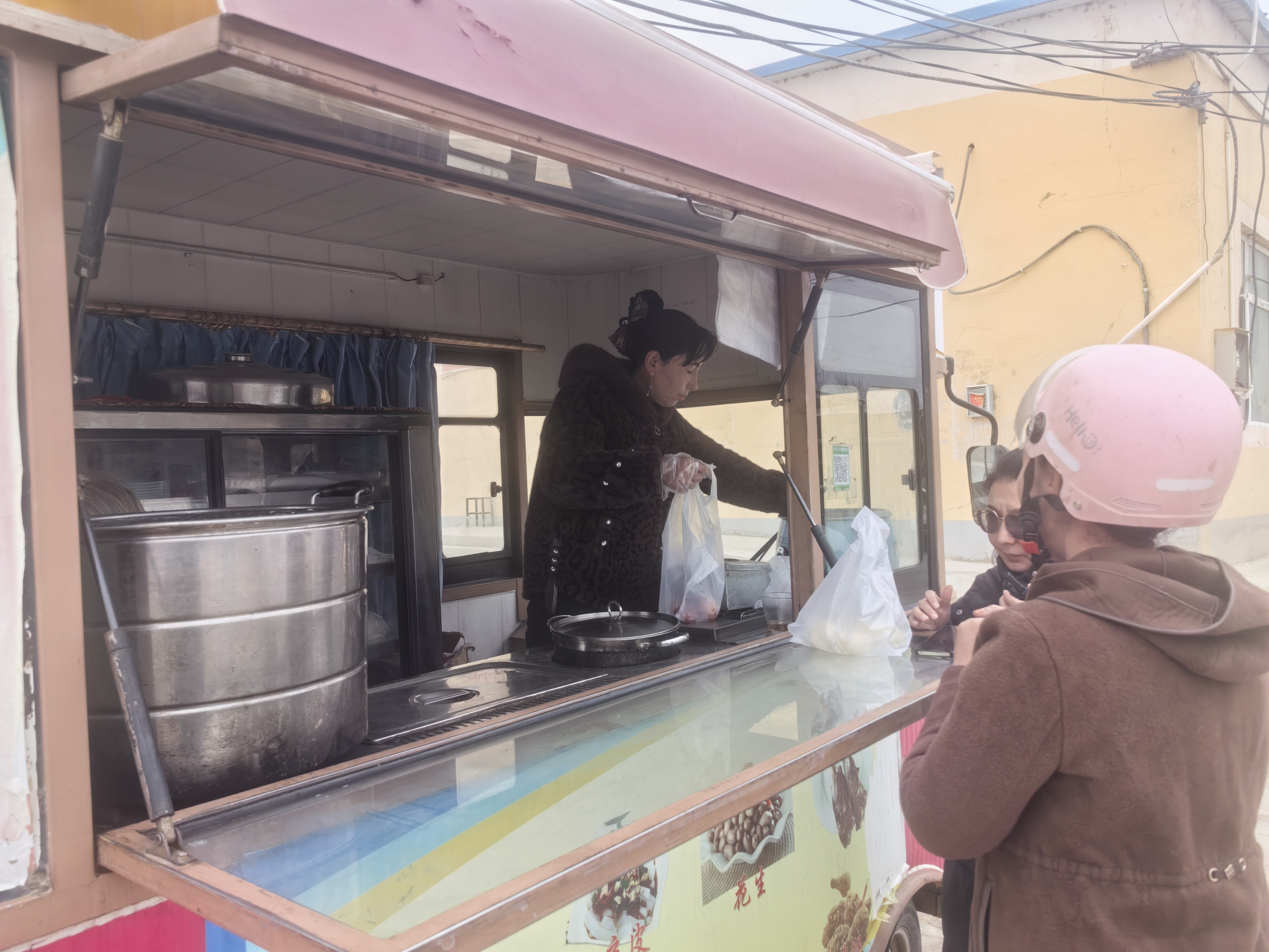 2020年,布海力且木汗•阿布迪克日木开启了餐车创业之路。她的餐车上,既有羊肺子、羊头、羊蹄这类融入和田饮食文化的特色佳肴——羊肺子灌制面糊搭配孜然、胡椒调味,煮熟后蘸醋与辣椒面食用,风味十足;也有凉粉、凉皮子、炸鸡腿、茶叶蛋等大众喜爱的小吃,还有烧烤、包子、油条等兼具烟火气与实用性的餐品,丰富的品类满足了不同食客的需求。