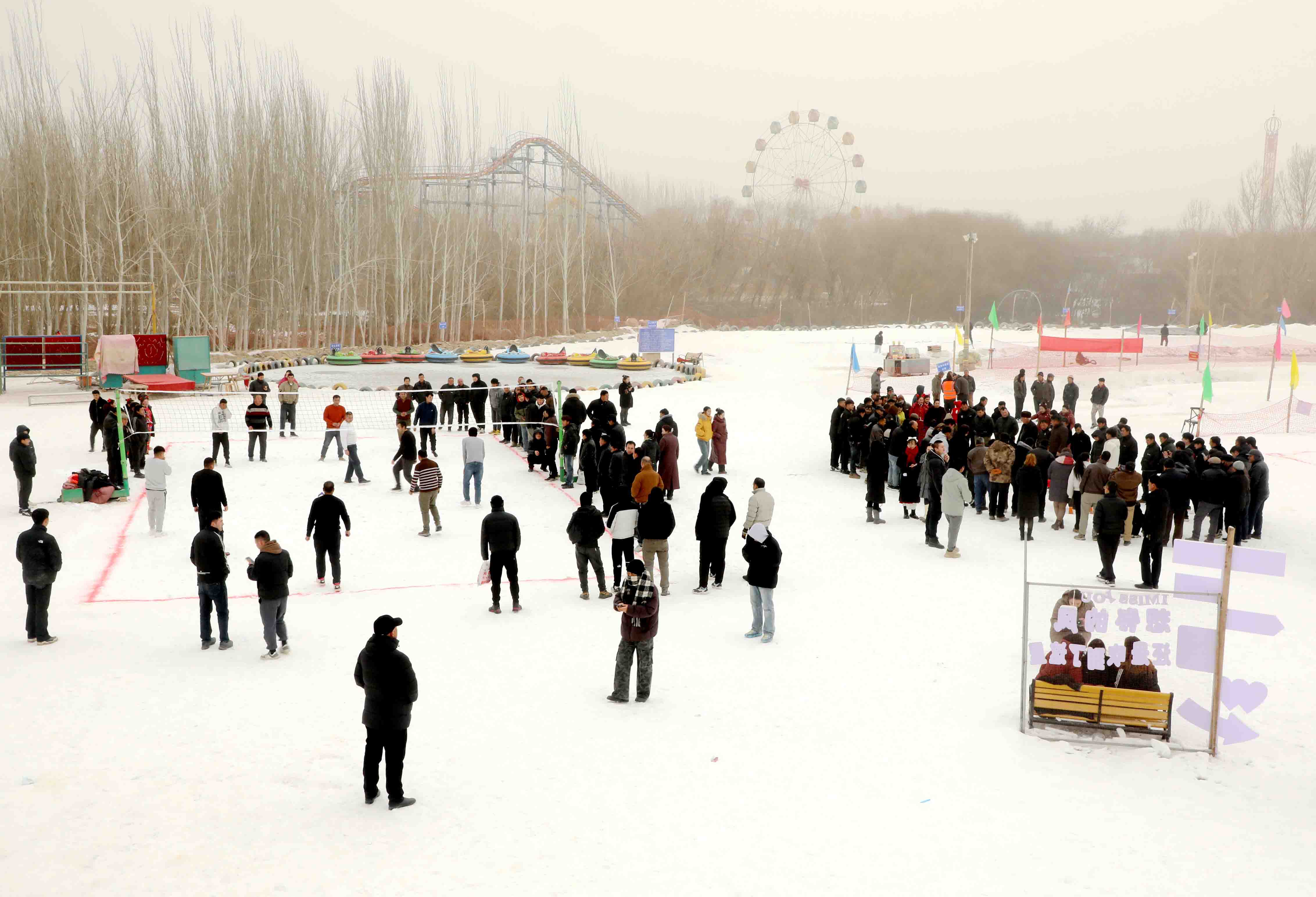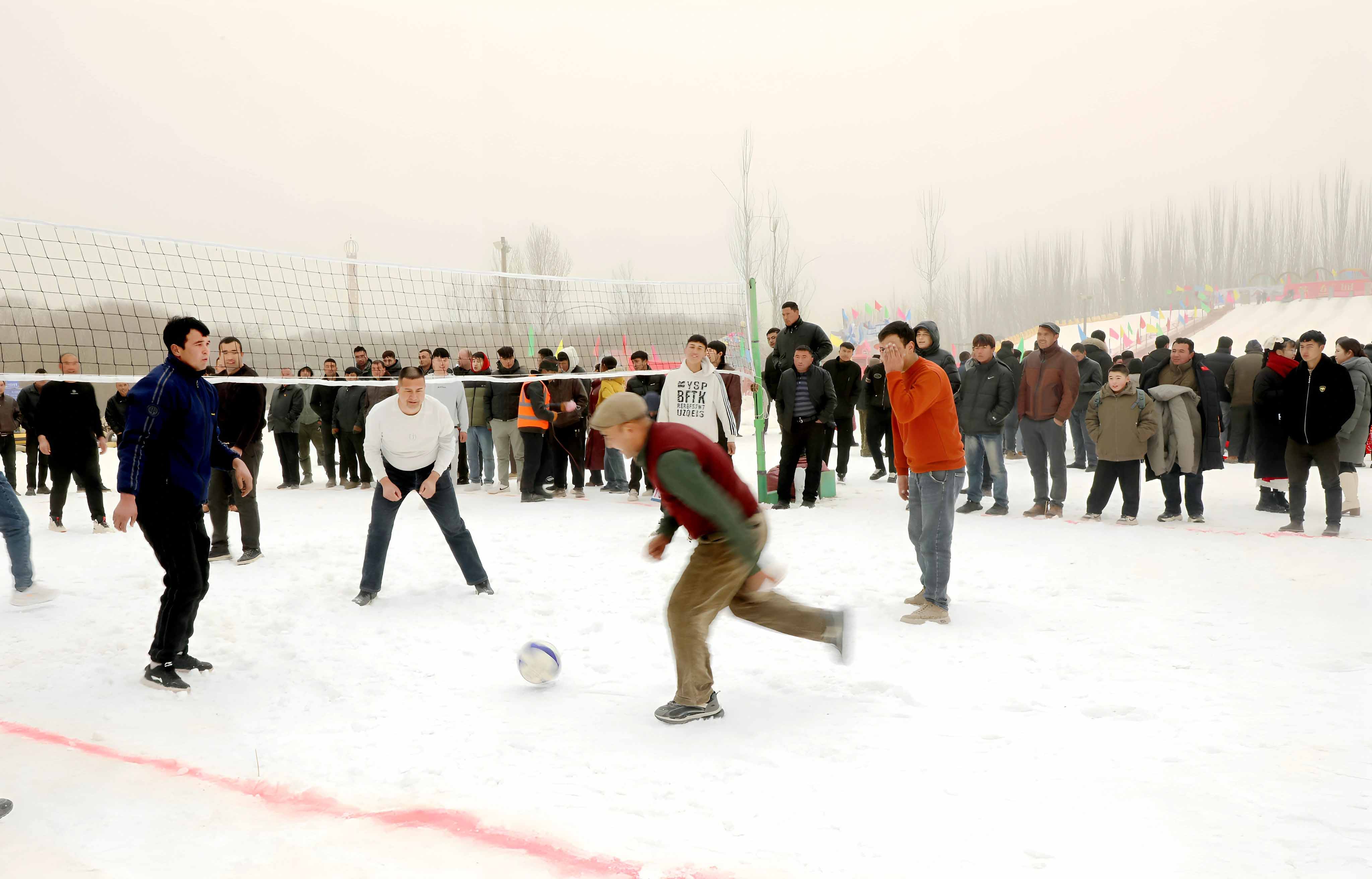 活动现场,随着现场群众的欢呼声,各项冰雪项目陆续展开。拔河的队伍攥着绳子齐发力,冰上陀螺在雪地里旋转,简单的项目让大家快速融入欢乐氛围。雪地排球和雪地足球场上,参赛队员们奔跑、传球、射门,每一个动作都引来阵阵喝彩,不管是参赛的还是围观的群众,都沉浸在运动的快乐里。