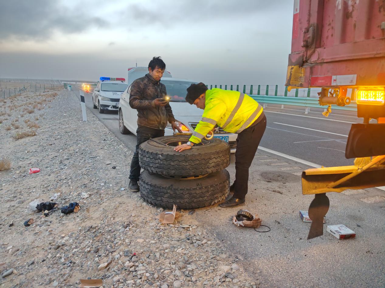 民辅警立即靠边停车,做好安全防护措施,在货车后方安全距离处摆放警示锥桶,疏导过往车辆减速慢行,防范二次事故发生。经询问货车驾驶人得知,车辆行驶至该路段时,轮胎突发故障无法正常行驶,因身处偏远路段,自己既不熟悉当地修理资源,也无法及时联系到专业修理人员,正焦急万分。