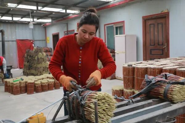 走进于田县斯也克乡金沙漠红柳串农民专业合作社,只见员工们正忙着分类、剪削、捆绑红柳枝,经机器打磨、人工整理,散乱的红柳枝被捆扎得整整齐齐,现场一派繁忙。奋斗是幸福源泉。吾麦尔江•玉努司经过七年的艰苦努力,合作社规模持续扩大,员工工资3000元左右,让大家不用远离家乡就能获得稳定收入。