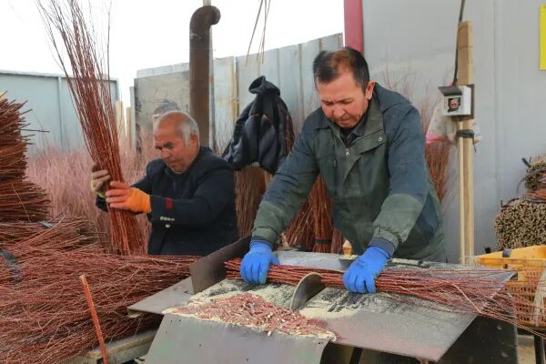 员工们在厂区分拣裁剪红柳枝,精心准备加工原料。阿依奴尔摄