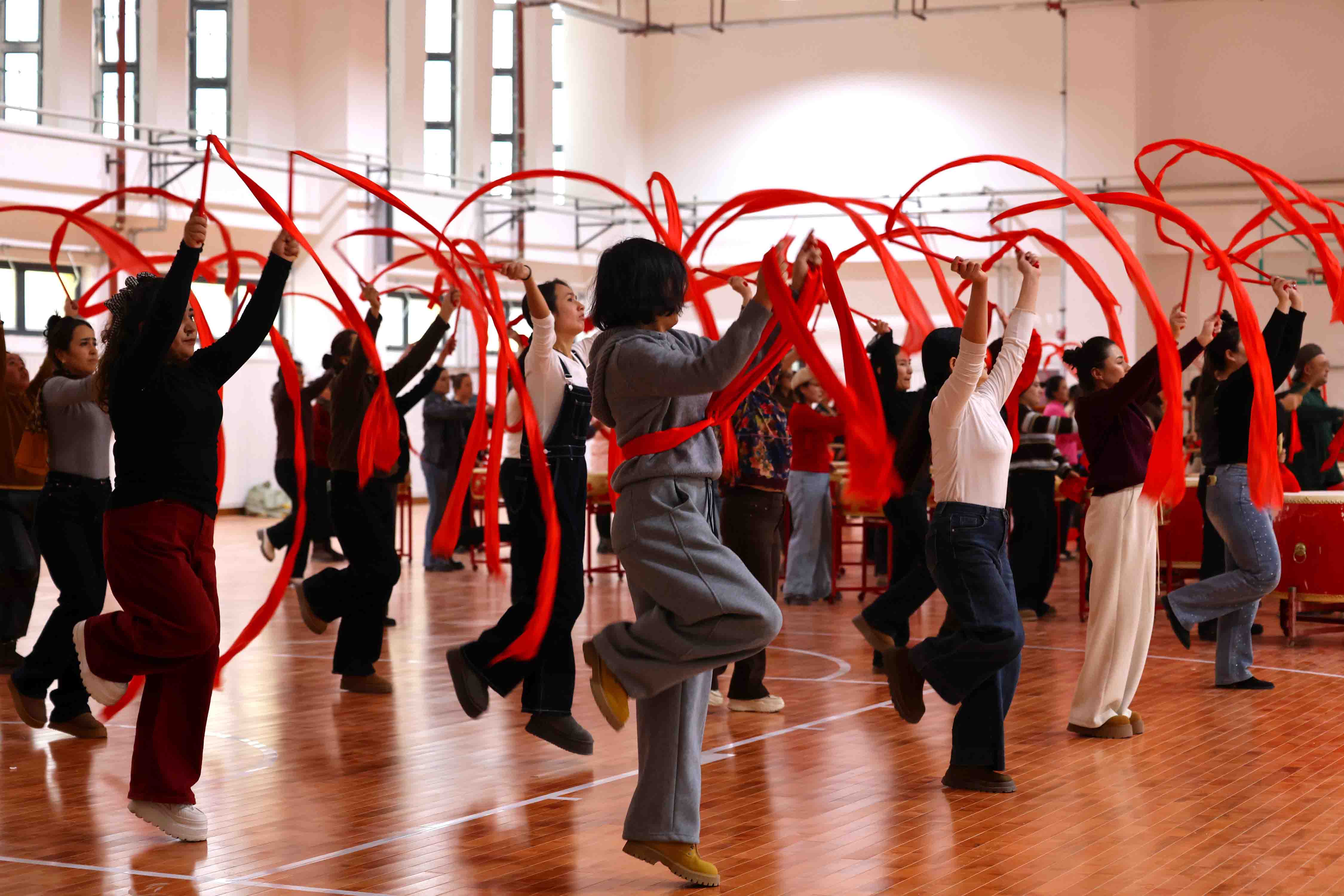 教育系统的排练现场则洋溢着传统与青春的碰撞。队员们以优美舞姿为纽带,将中华优秀传统文化与社火表演深度融合,举手投足间既有民俗典雅韵味,又具有新时代青春活力。排练间隙,各族师生围坐交流技巧、纠正细节,在精益求精中传承文化根脉,让中华优秀传统文化在年轻一代手中焕发新生。这种以文化为桥的传承与互动,正是文化润疆工作在校园的生动实践,为铸牢中华民族共同体意识注入青春力量。
