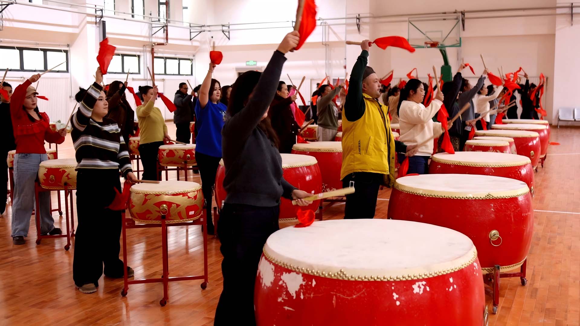 幸福街道《万马奔腾》排练现场则尽显豪迈气势。震天锣鼓划破长空,队员们身着色彩艳丽的服饰,腾跃、挥臂、转身间力道十足,将马年的昂扬姿态与街道干群同心同德、乘风破浪的奋进模样融为一体。每一次队形变换都整齐划一,每一声口号都铿锵有力,生动展现出新时代基层干部群众并肩向前的蓬勃活力。