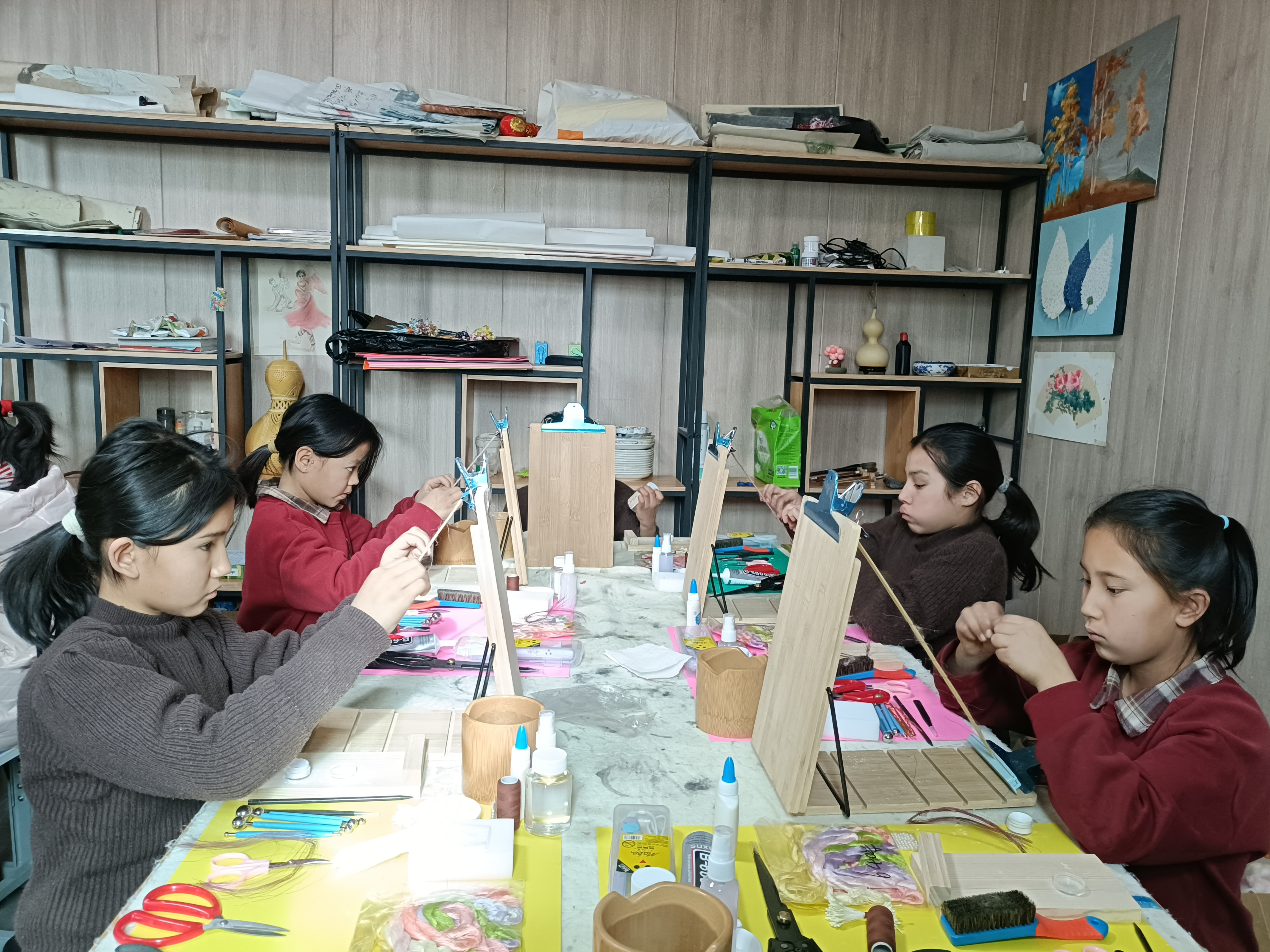 非遗绒花班内,孩子们专注捻丝、粘绒。伊帕尔古丽摄