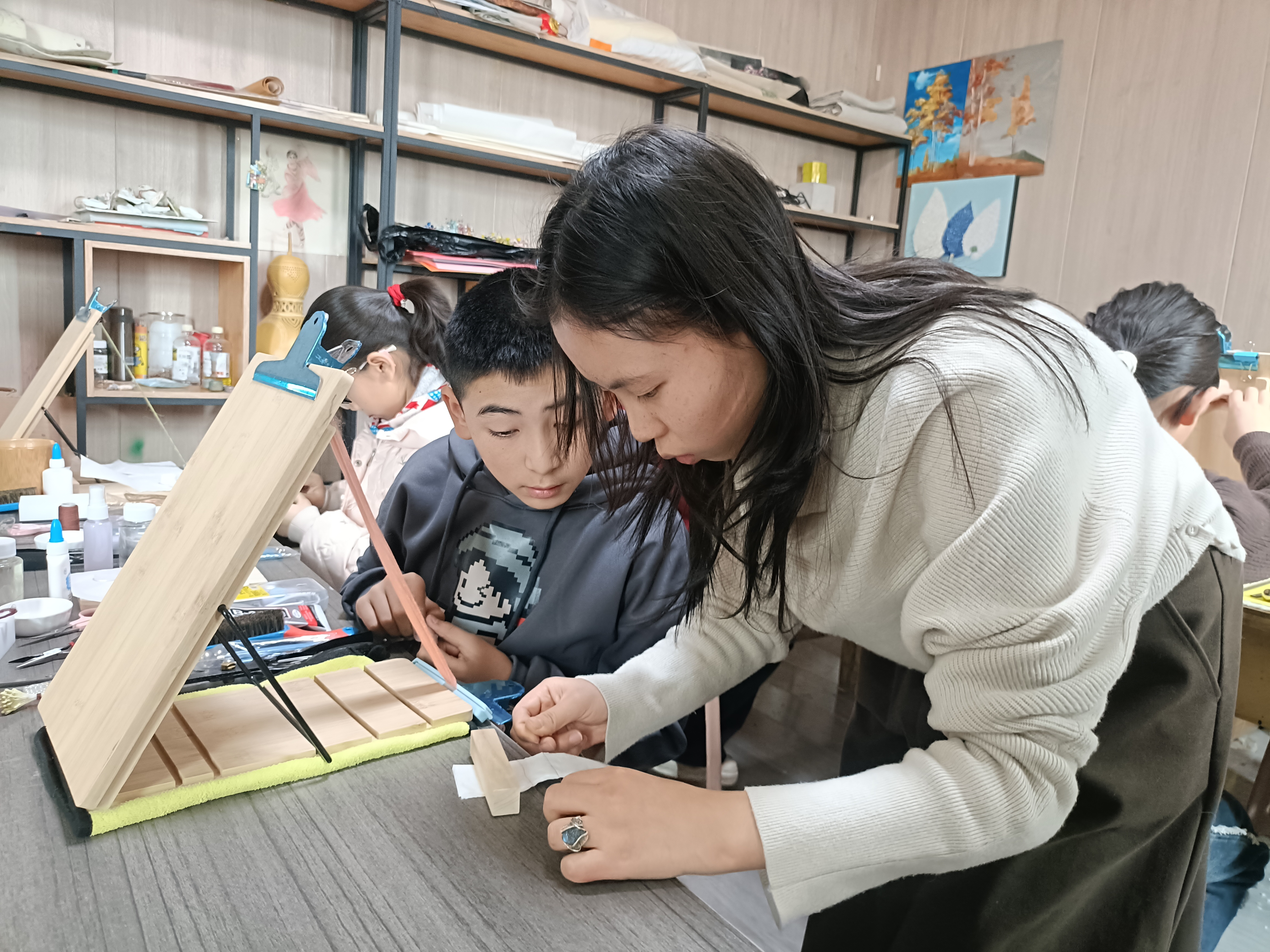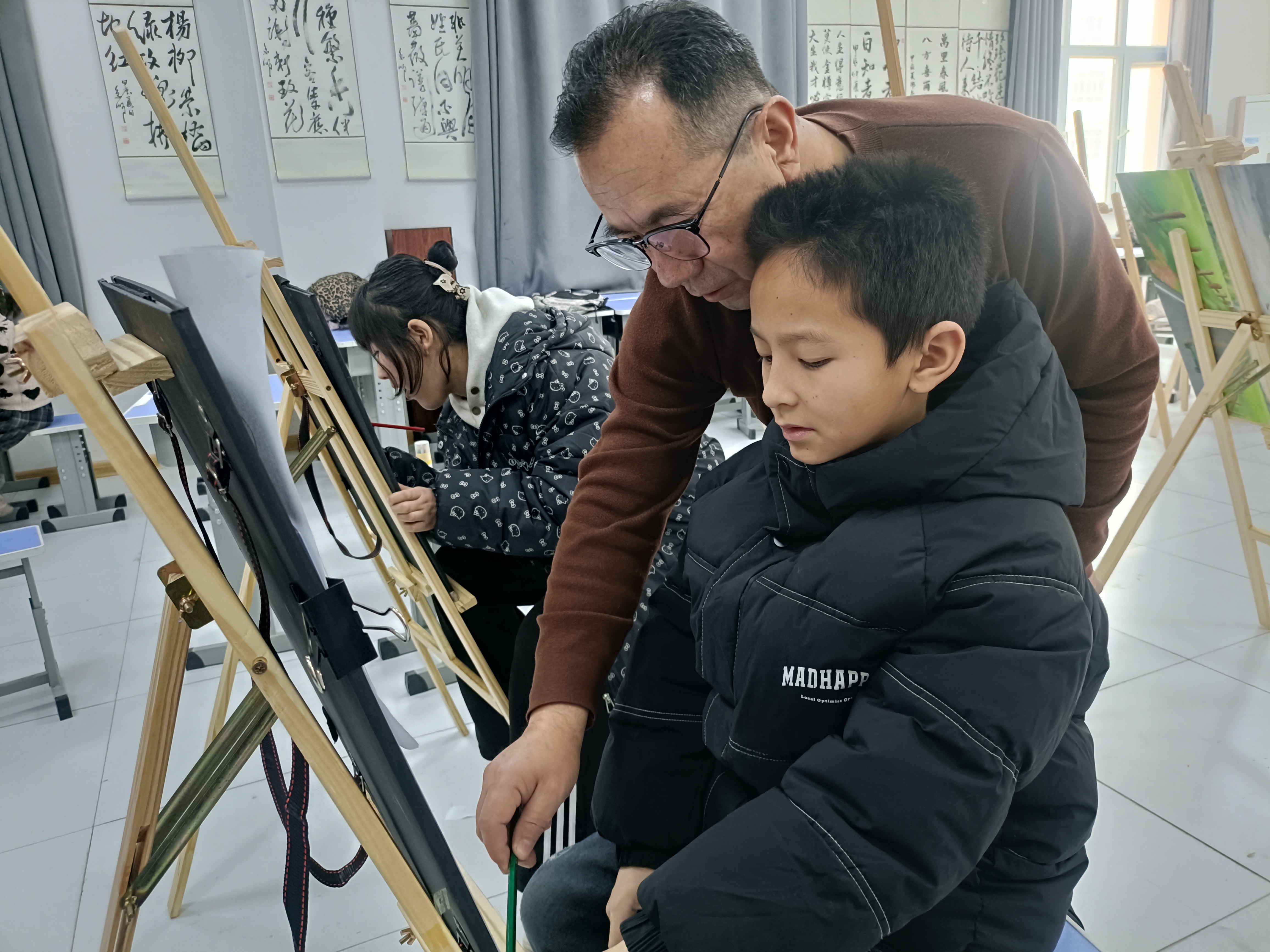 绘画班的孩子们执笔勾勒,老师俯身细致点拨构图与色彩。姆克热木摄