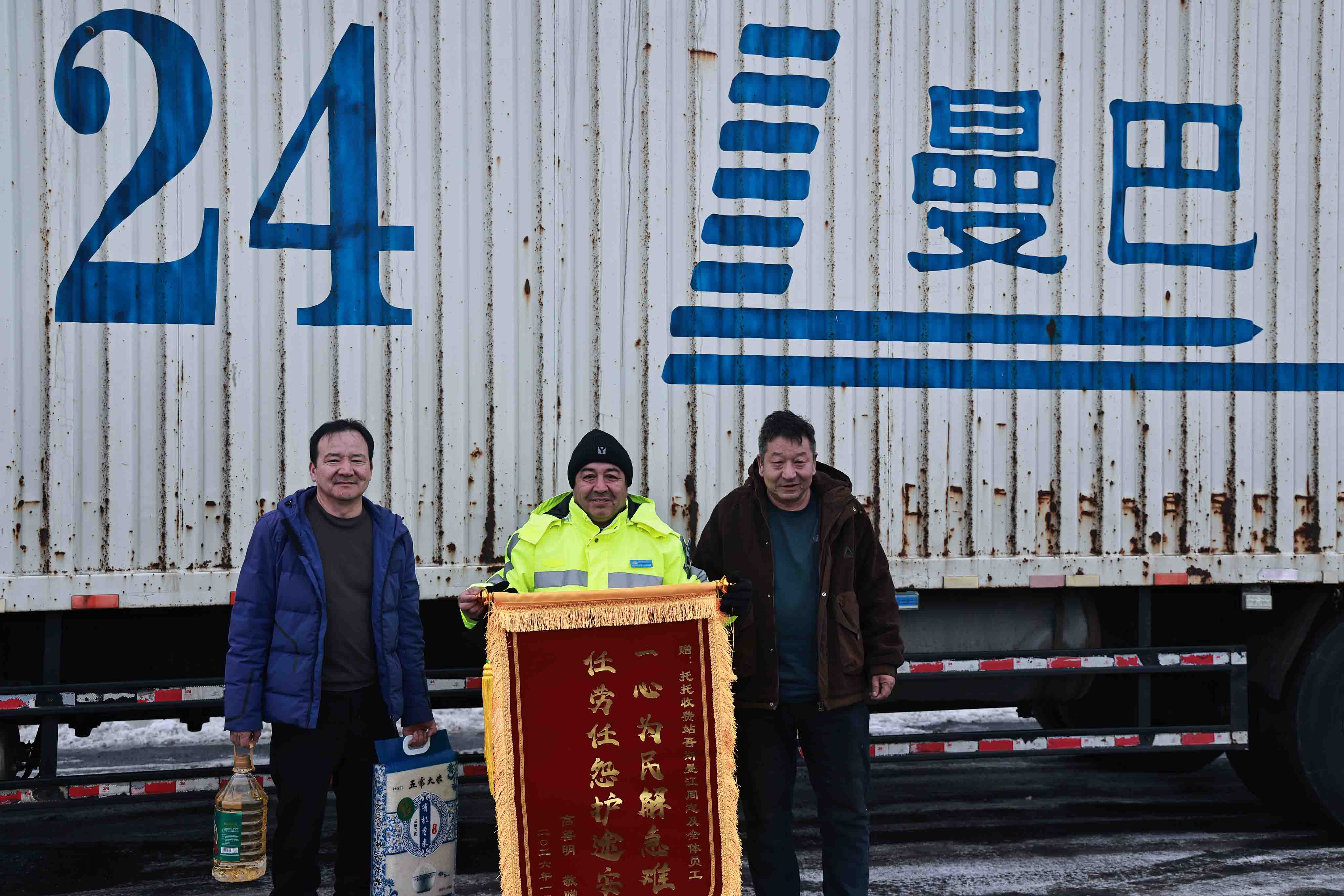 当时,现场气温低至零下二十多度,寒风刺骨,脱下防寒大衣后仅着单衣的吾斯曼江•吾曼尔,不顾严寒侵袭,紧紧追着缓慢挪动的货车,反复铺垫大衣三四次,直至货车成功驶离打滑路段、安全脱困。据悉,高善明驾驶的货车上满载着来自全国各地的快递,为了确保送货时效,不耽误快件送达,他在车辆脱困后未能当场停留致谢,心中却一直铭记着这份寒冬里的温暖。此次特意返程送锦旗,便是高善明酝酿已久、想要当面致谢的心愿。