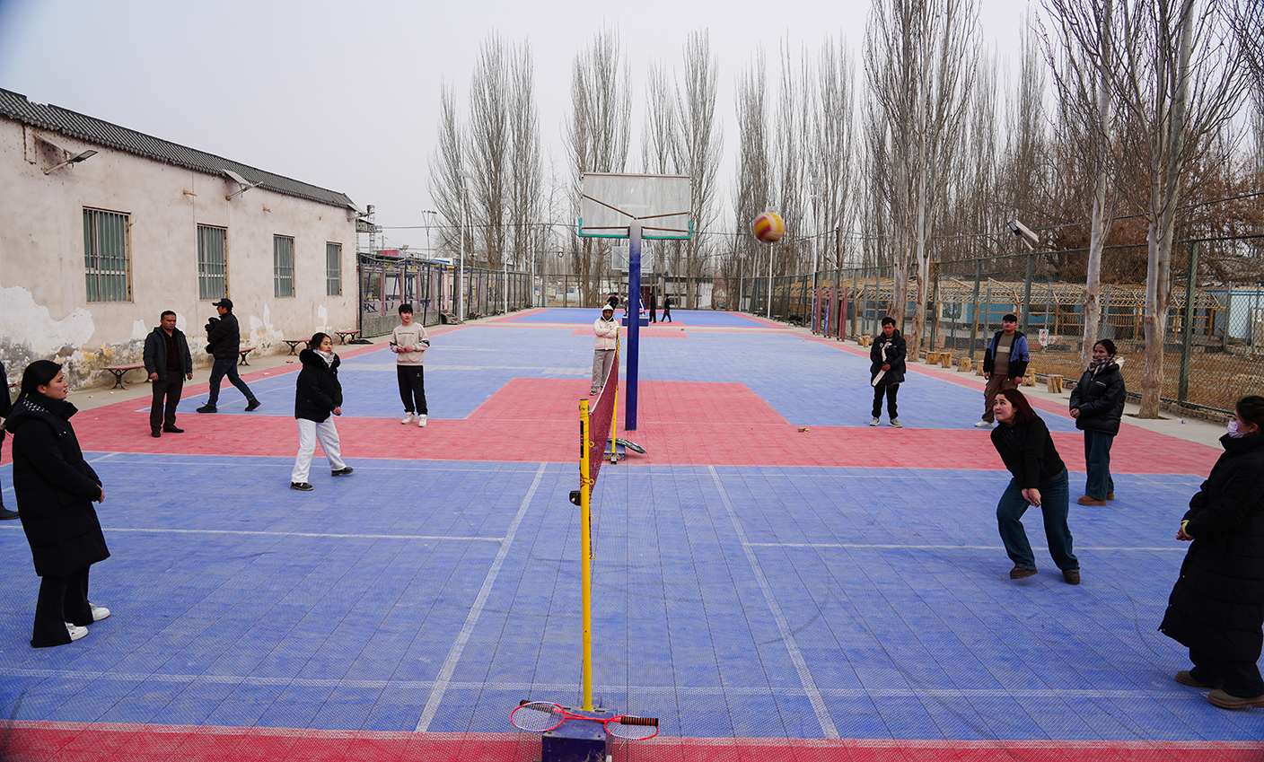 阿热勒乡夏玛勒巴格村的广场上,往日的宁静被热闹打破。返乡大学生带着篮球、排球、羽毛球赶来,招呼着乡亲们一起动起来。篮球场上,小伙子们奔跑传球,汗水滴落塞场;排球网前,经久未见的伙伴儿组队对阵,笑着喊着不服输;另一边,跳绳翻飞、毽子起落,简单的运动里,满是活力和欢喜。你帮我捡球,我为你喝彩,大学生与冬闲的乡邻们融成一片,寂静的乡村因青年学子的回归被欢声笑语填满。