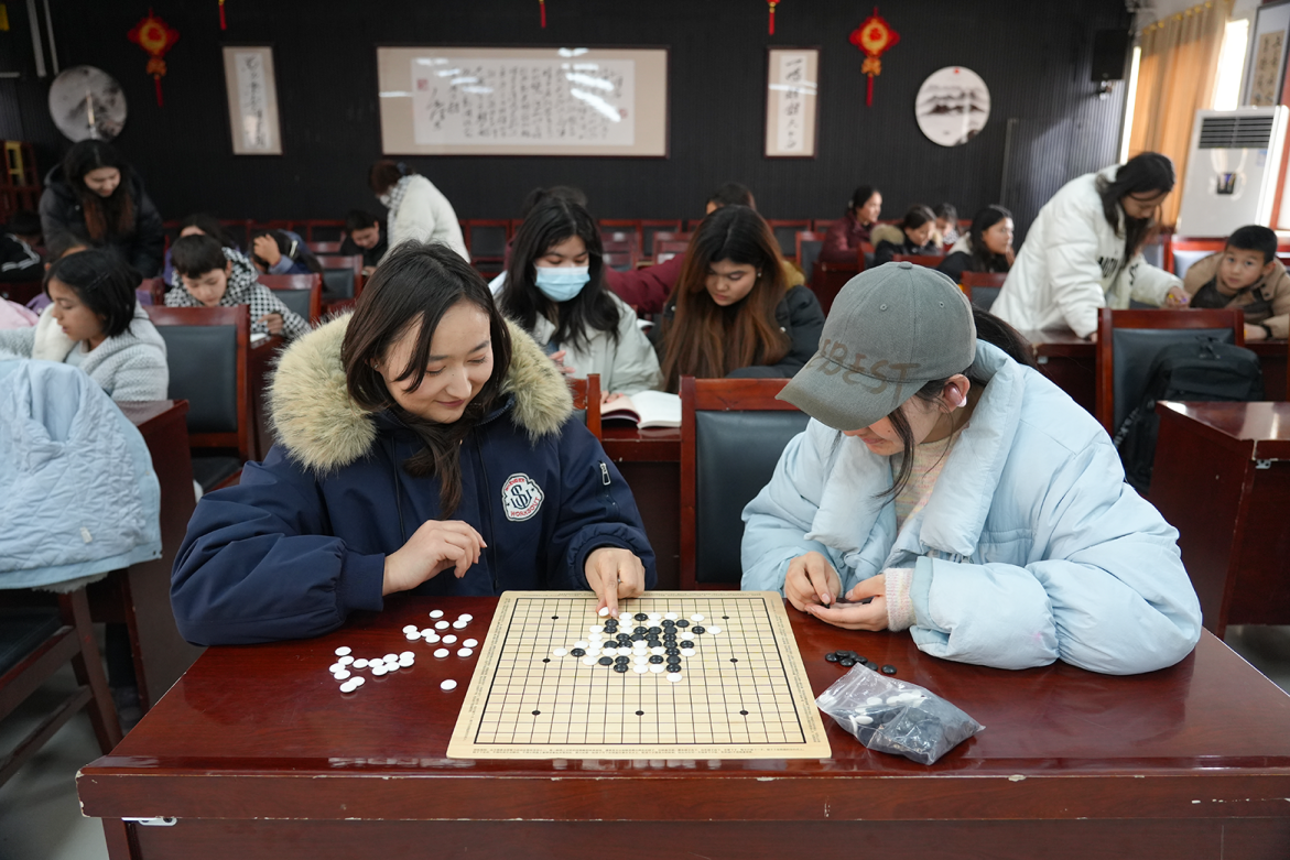 返乡大学生在陪中学生下围棋。汪建华摄
