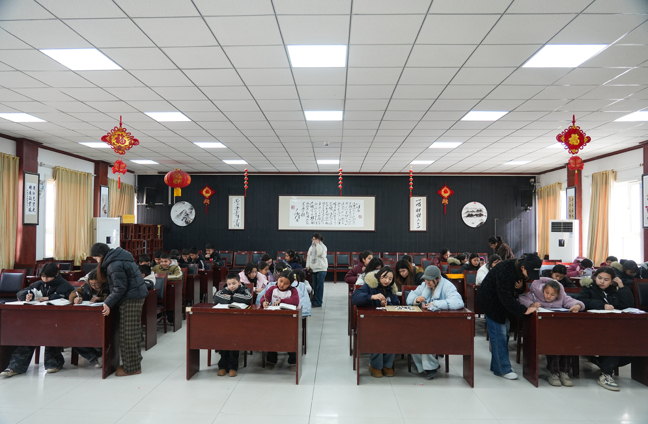返乡大学生在村委会石榴籽小课堂辅导学弟学妹写作业。汪建华摄