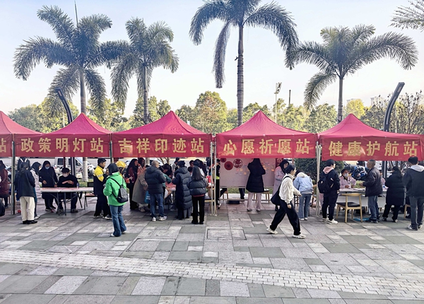 驿站外,一场主题为“暖心行囊•温馨过年”的游园会同步开展。市公安局红塔分局交警大队、区总工会、团区委、区妇联、市三医院等多家单位及部分社会团体设立服务摊点,为参与活动的劳动者免费提供血压、血糖检测,理发等服务。现场还安排了送春联、张贴新年心愿、交通安全知识问答等互动环节,大家完成打卡后即可领取暖心礼包。