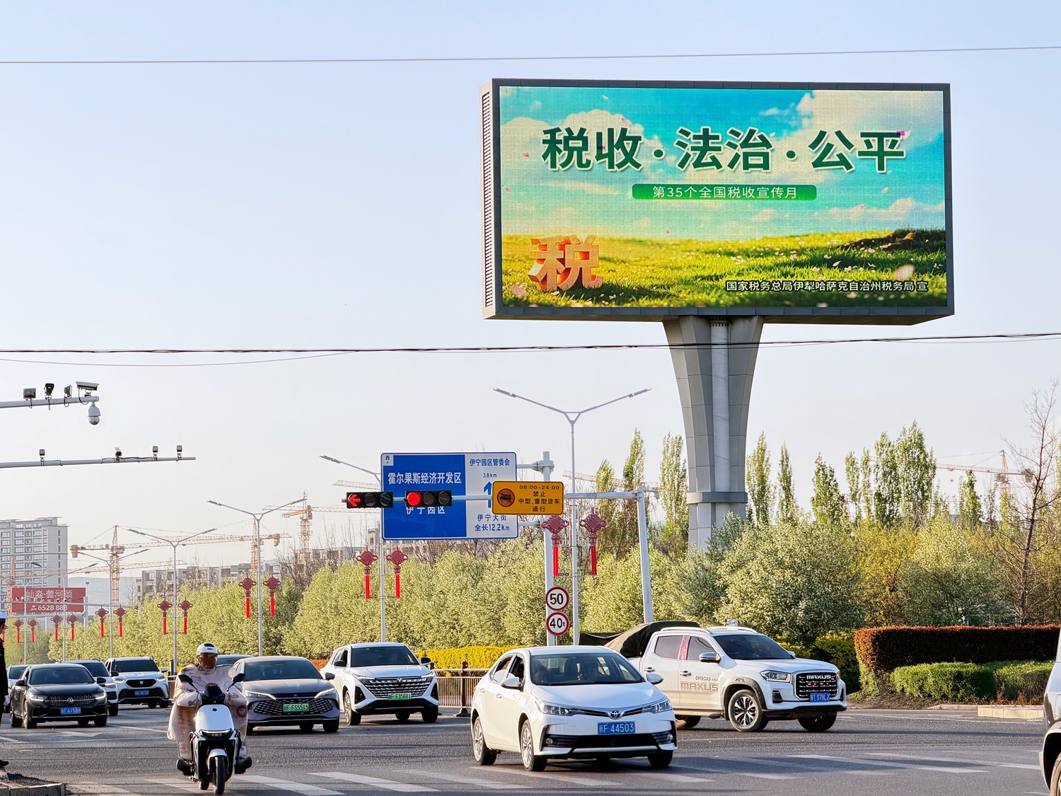 在伊宁市,税务部门利用户外大屏滚动播放“税收•法治•公平”主题宣传海报,醒目的画面吸引过往群众驻足观看、主动了解,在潜移默化中传递依法纳税、合规经营的理念。