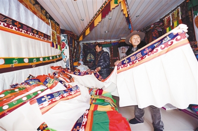 藏装、卡塞(油炸果)、彩色酥油花、罗萨美朵(藏年花)、五彩麦穗、羊头等地域特色年货成为拉萨年货市场的主流。家住拉萨市尼木县普松乡的吉美,通过在拉萨市小昭寺门口租房批发“香布”、经幡、门帘等,近一个月收入达一万多元。“香布”是藏式建筑的一种特殊装饰,所有的藏式门上部都悬挂着用长条形织物打成褶的类似遮阳棚的布帏装饰,主要悬挂于窗沿、屋檐以及门上部,通常主体颜色为白色,再配上红蓝黄等颜色的边沿,每年藏历新年到来之前更换一次,祈求新意和吉祥。