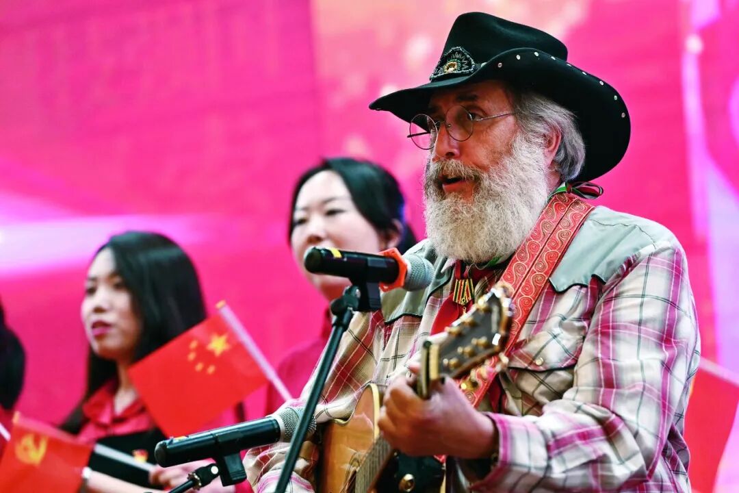 马克·力文:歌颂你——亲爱的中国共产党。他有圣诞老人般的大胡子,一顶绣着自己名字的小红帽,一把中英文签名的木吉他,他走遍大半个中国,用乡村音乐讲述中国故事。他被媒体誉为美国当代“乡村音乐之父”,他就是美国乡村音乐人、社会学家、中国政府友谊奖获得者、中央民族大学教授马克·力文(Mark Levine,美国)。