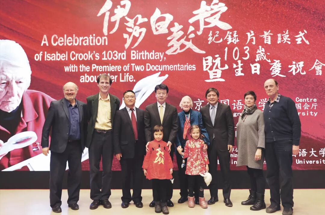 柯马凯(右一)在母亲伊莎白教授纪录片首映式暨103岁生日庆祝会上