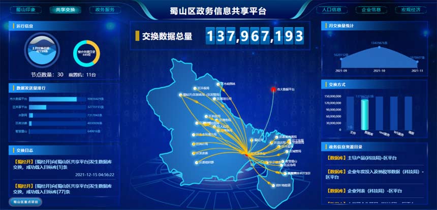 蜀山区在全市县区中最先建设“政务信息共享交换平台”,全面整合了全区各业务部门政务系统的数据资源,并向市大数据平台常态化推送,给蜀山区的数据“安家”。