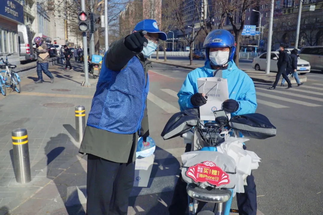 同时志愿者们还向在严寒天气中工作的环卫工人、外卖小哥们,送去手套、口罩等保暖物资。感谢他们为提升城市服务质量、维护人居环境付出的辛勤劳动。叮嘱他们注意防寒保暖,工作时做好自我保护、严格遵守交通法规,预防交通事故的发生。