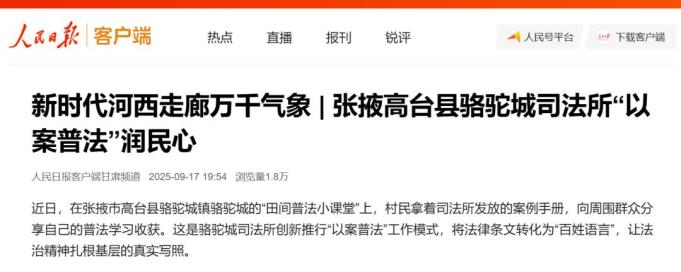 9月17日,人民日报客户端甘肃频道发布了甘肃省司法厅推荐的工作新闻稿件——《新时代河西走廊万千气象 |张掖高台县骆驼城司法所“以案普法”润民心》,现予以转载。