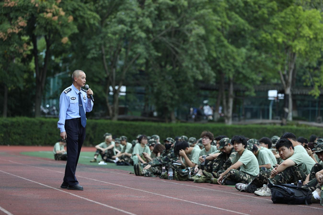 活动尾声,特邀主持人、内江市公安局民警李少言登台,深情演唱《祖国不会忘记》。悠扬的歌声、真挚的情感,既是对现场军训新生的殷切寄语,也传递出浓厚的爱国情怀。引发全场师生共鸣,不少人跟着旋律放声合唱,将活动氛围推向最高潮。