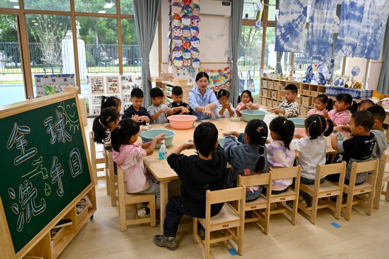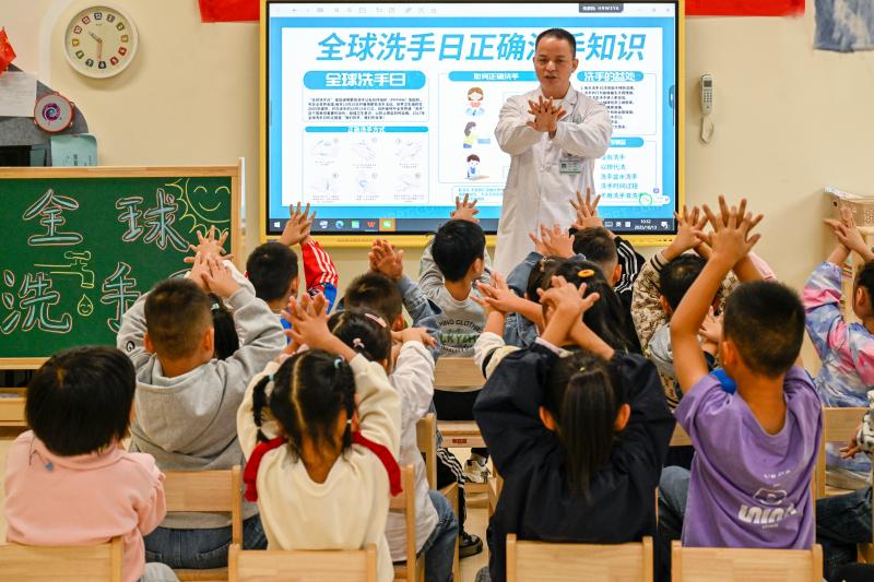 2025年10月13日,在安徽省合肥市庐阳区林店街道宿州路幼儿园云锦分园,小朋友们正在医护人员的指导下学习如何正确洗手。10月15日是“全球洗手日”,该园联合社区林店卫生服务中心开展“守护双手清洁,筑牢健康防线”主题活动,通过多种形式向幼儿讲解个人卫生行为对健康的影响,引导孩子们加强卫生意识、防止疾病传染。(庐阳区人民政府)
