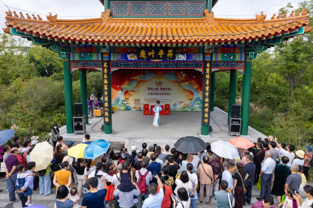 国庆中秋假期,“百戏入皖·星耀合肥”江淮好戏连台惠民展演在合肥骆岗公园火热开展,吸引众多游客驻足观看。记者方妍摄