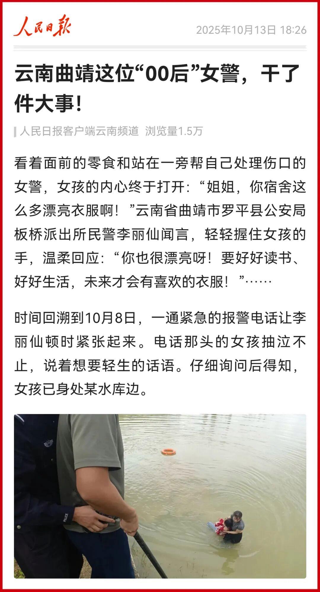 10月13日,《人民日报》客户端以《云南曲靖这位“00后”女警,干了件大事!》为题,报道了罗平县公安局板桥派出所民警李丽仙救落水女孩一事。