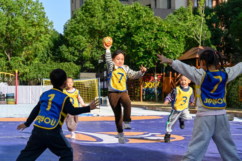 2025年10月23日,在安徽省合肥市庐阳区林店街道双岗幼教集团逍然居分园,小朋友们正在进行手球对抗比赛。近年来,该幼儿园践行庐阳区“YUE动庐阳 欢乐校园”五大行动,积极锻炼幼儿强健体格,开发以手球为主题的运动特色课程,不仅让小朋友学有所乐、学有所长,同时也推动少儿科学运动,健康成长。(庐阳区人民政府)