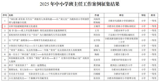同时,2025年合肥市中小学班主任工作案例评比结果也揭晓了结果,王晓芳老师提交的案例 《以班刊创建赋能班级文化建设》,凭借其创新的理念、扎实的实践和显著的育人成效,在众多参赛作品中脱颖而出,荣获市级一等奖。这一荣誉是我校在德育工作和班主任专业化成长道路上结出的又一硕果。