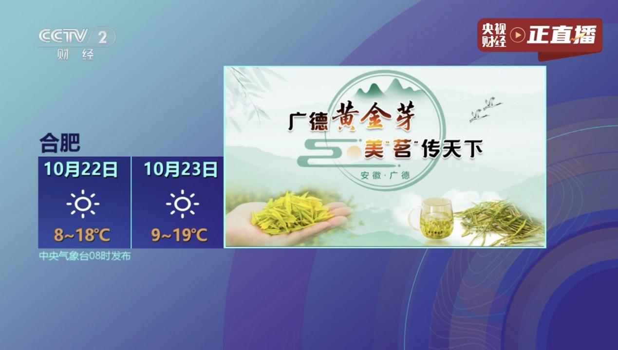 广德市农业农村局选择在 CCTV - 2《第一时间》城市天气预报栏目投放宣传,是一次精准的品牌传播策略选择,依托央视的国家级媒体影响力,为广德黄金芽的品牌升级带来多重利好。《第一时间》作为央视财经频道全天第一档新闻资讯类节目,具有极高的收视率与广泛的受众群体。其城市天气预报板块,更是在每天的黄金时段,吸引着大量关注天气、关注生活的观众。该栏目定位精准,聚焦 30 - 55岁、高学历、高收入的职场中坚力量,这一群体不仅具有较强的消费能力,更注重生活品质与健康养生,与广德黄金芽的目标消费群体高度契合。借助这一平台,广德黄金芽能够实现对核心消费群体的精准触达,有效提升品牌认知度与美誉度。