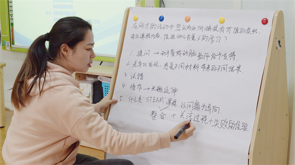 经验分享环节,四位幼教工作者分别从STEAM教育理念、“活教育”视角下的食育课程、课程审议机制、点彩艺术融入日常课程等方面,介绍了各自的实践成果。