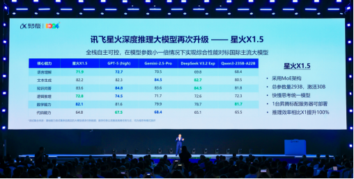 发布会上,深度推理大模型讯飞星火X1.5正式亮相。星火X1.5采用MoE架构,总参数量293B、激活30B,推理效率相比星火X1提升100%。它的语言理解、文本生成、知识问答、逻辑推理、数学能力、代码能力等六大核心能力全面对标国际主流,其中数学能力持续保持国际领先。其多语言能力覆盖超过130个语种,整体性能达到GPT-5的95%以上,其中拉美、东盟等14个重点语言效果领先,为世界提供了AI发展的“第二选择”。