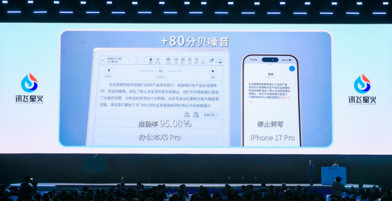 凭借独家“AI+麦克风阵列技术”,讯飞智能办公本X5通过首创的上4下4环八麦克风阵列实现超强抗噪,识别效果远超iPhone 17 Pro,高噪环境下识别准确率达95.08%;讯飞AI翻译耳机首创单耳三麦多感融合降噪系统,在复杂噪声下识别准确率高达97.1%;讯飞双屏翻译机2.0则独创强降噪模式,在90dB噪音下识别率达98.69%。此外,业界首个软硬一体的讯飞同传麦克风能实现自动翻译免切换,同传播报首响延迟低于2s,支持私有化部署。