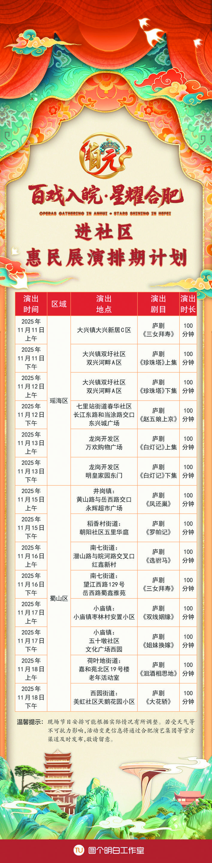 好戏连台待君赏,文化惠民暖人心。一场场精彩绝伦的戏曲演出,一次次文化与心灵的碰撞,“百戏入皖·星耀合肥”进社区惠民展演即将拉开帷幕,诚邀广大市民群众前往现场观看,共赴这场充满魅力的戏曲之约!(记者夏伟/文、邓晓伟/制图)