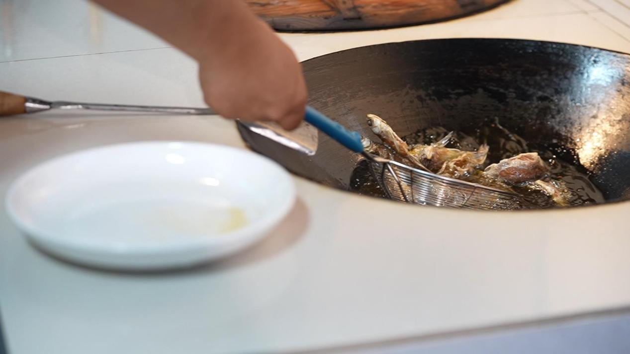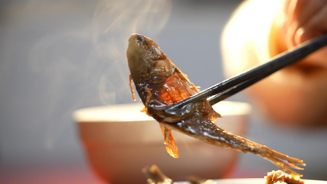 他把晒好的鱼入油清炸,“滋啦”一声,油花裹着鱼身炸开,瞬间的高温逼发出焦香,锁住鲜美的同时,成就了“咔嚓”脆响的金黄外皮。但这仅是风味的序章,真正的精髓在于接下来数小时的小火慢煨。