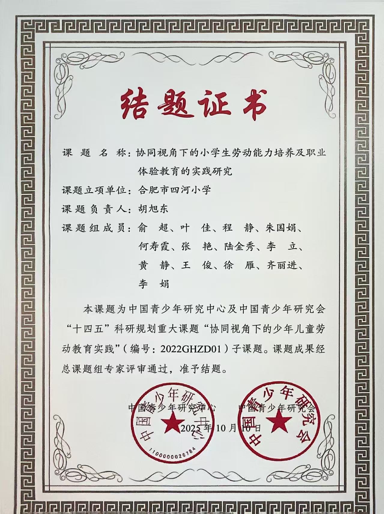近日,合肥市四河小学收到中国青少年研究中心及中国青少年研究会颁发的结题证书,由胡旭东老师负责的课题《协同视角下的小学生劳动能力培养及职业体验教育的实践研究》,作为中国青少年研究中心及中国青少年研究会“十四五”科研规划重大课题“协同视角下的少年儿童劳动教育实践”(编号:2022GHZD01)子课题,经总课题组专家评审通过,准予结题。