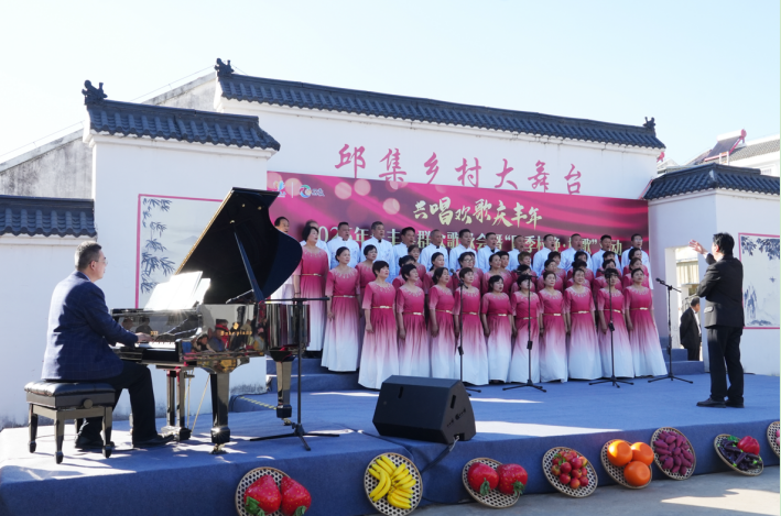 冬日暖阳洒落在村院农房,错落光影间,“邱集乡村大舞台”显得熠熠生辉。随着开场舞《五谷丰登》精彩上演,群众表演者们身着喜庆的服装,动作舒展灵动,将丰收的欢悦传递给在场每一位观众,正式拉开了歌咏会的序幕。