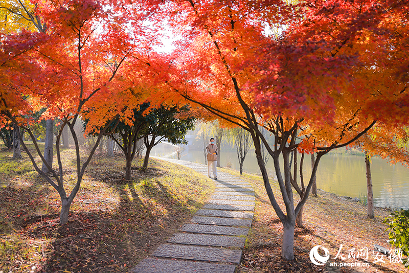 双清湾公园内一处林荫小道,行人从火红的枫林下经过。人民网记者王晓飞摄