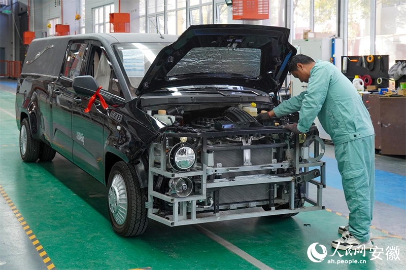 安徽祺力专用车制造有限公司内,工人正在检查车辆。人民网记者陈若天摄