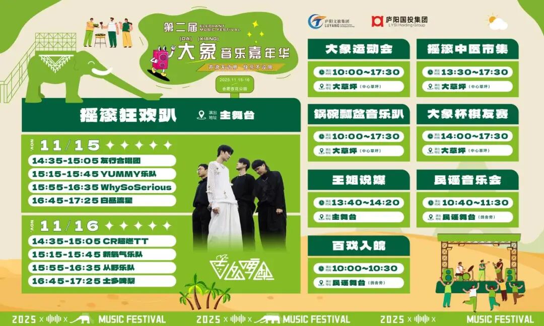 作为活力四射的“白天场”,第二届大象音乐嘉年华将在杏花公园热力开唱。当暖阳透过金黄的银杏叶,主舞台与民谣舞台将共同奏响冬日交响。WhySoSerious、CR超燃π、白昼流星等8支摇滚乐队将轮番炸场;民谣舞台不仅有经典民谣演唱,还别出心裁融入“百戏入皖”戏曲元素,实现传统与现代的碰撞。除了音乐主线,现场更铺开了一幅美好的冬日创意画卷。锅碗瓢盆音乐趴、大象运动会、摇滚中医市集、大象杯棋友赛等特色环节环环相接,加上备受关注的“王姐说媒”相亲活动,为市民游客带来耳目一新的娱乐体验。本次活动免费向公众开放,参与者还能与合肥经典地标逍遥津大象滑滑梯来场邂逅,解锁庐阳文旅限定手办。