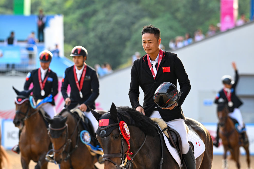 全运会马术比赛颁奖仪式结束后,总有一个庄重又温情的环节——“胜利骑乘”。获奖骑手佩戴奖牌,骑马绕场一周,接受观众祝贺。