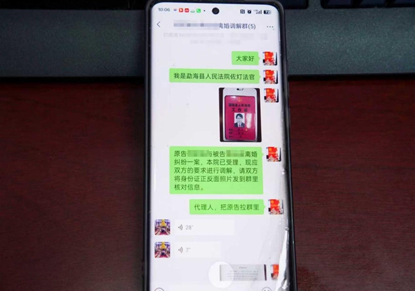 2024年3月14日,佐灯携巡回审判团队前往勐宋乡调解三起案件。其中一起案件的原告为第二次起诉离婚,虽已符合判离条件,但为避免留下心结,佐灯决定上门调解。因原被告都为哈尼族,她主动换上哈尼族服饰,用哈尼语沟通,将婚姻法律条款、子女抚养和财产分割等规定转化为群众易懂的语言,在调解中同步普法。